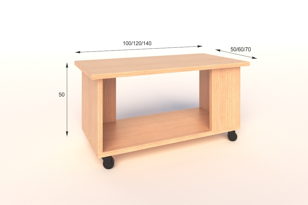 Žurnālgaldiņš izgatavots no 25 mm bieza LKSP. Detaļu malas apstrādātas ar 2 mm biezu plastikāta maliņu. Divi ritentiņi ir aprīkoti ar bremzi.